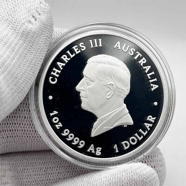 Showcases the Dan Thorne effigy of His Majesty King Charles III, along with the coin's weight, fineness, and face value. Each coin is presented in a protective acrylic capsule, safeguarding its condition and finish.